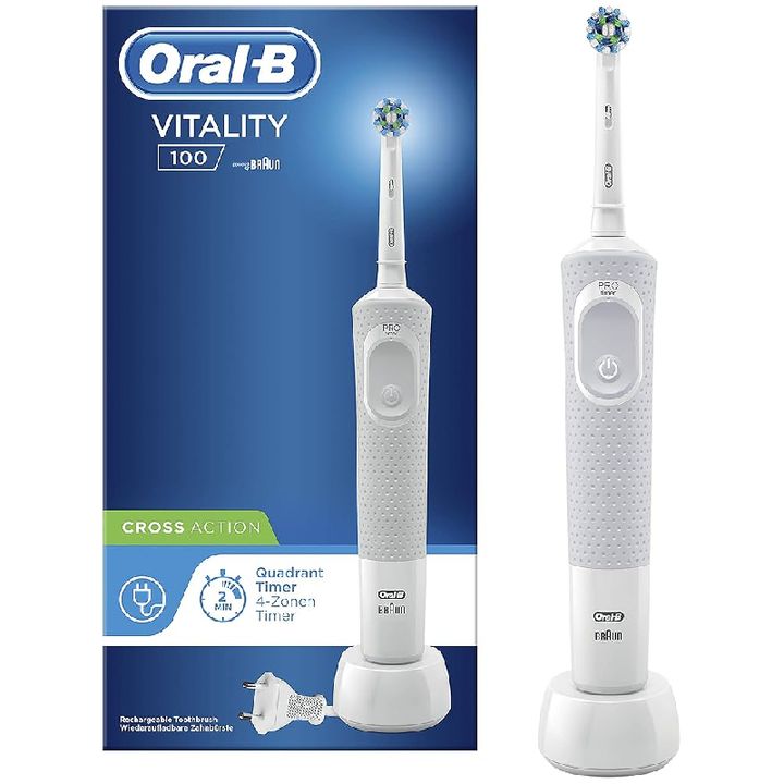 El Oral B Cepillo Eléctrico Vitality 100 Cross Action Blanco utiliza una tecnología de limpieza muy avanzada que rodea cada diente, eliminando más placa y estimulando suavemente las encías, consiguiendo de esta forma, una sensación de frescura única en la boca. Su potente sistema de oscilaciones garantiza una limpieza hasta 2 veces más efectiva que un cepillo manual.